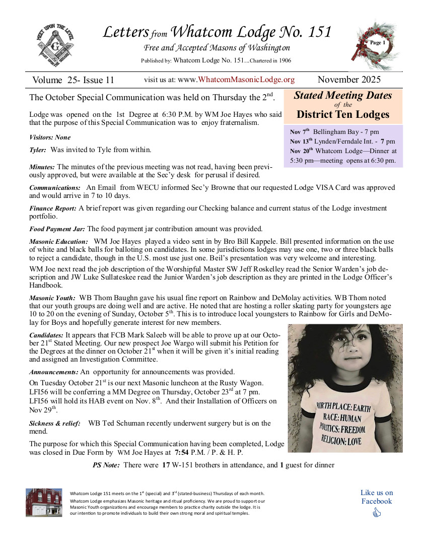 Whatcom Lodge #151 Newsletters Current Issue Previous WHATCOM LODGE #151 issues: 2025 Jan Feb Mar Apr May June July AugustSeptember 2024 Jan Feb Mar AprMayJune July Aug Sept Oct Nov Dec 2023 JanFebMarAprMay JunJulAugSepOctNovDec 2022 Jan-Feb Apr-MayJunJulyAugSepOct NovDec 2021 JanuaryFebruaryMarchAprilMayJuneJulyAugustSeptember OctoberNovemberDecember 2020 Jan – MarDecember 2019 Jan/FebMarchAprilMay/JuneAugustSeptemberOctober NovemberDecember 2018 JanuaryFebruaryMarchAprilMayJuneJul/AugSeptember OctoberNovemberDecember 2017 January FebruaryMarchAprilMayJune July August September OctoberNovemberDecember 2016 JanuaryFebruaryMarchApril MayJuneJulyAugust SeptemberOctoberNovemberDecember 2015 JanuaryFebruaryMarchApril MayJuneJulyAugust SeptemberOctoberNovemberDecember 2014 JanuaryFebruaryMarchApril MayJuneJulyAugust SeptemberOctoberNovemberDecember 2013 JanuaryFebruaryMarchApril MayJuneJulyAugust SeptemberOctoberNovemberDecember 2012 JanuaryFebruaryMarchApril MayJuneJulyAugust SeptemberOctoberNovemberDecember 2011 JanuaryFebruaryMarchApril MayJuneJulyAugust SeptemberOctoberNovemberDecember 2010 JanuaryFebruaryMarchApril MayJuneJulyAugust SeptemberOctoberNovemberDecember 2009 JanuaryFebruaryMarchApril MayJuneJulyAugust SeptemberOctoberNovemberDecember 2008 JanuaryFebruaryMarchApril MayJuneJulyAugust SeptemberOctoberNovemberDecember